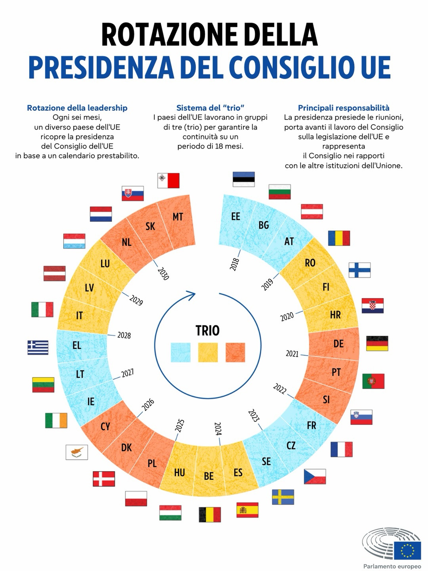 Esiste un #calendarioprestabilito anche per chi deve ricoprire la #Presidenza del #Consiglio dell' 🇪🇺🇪🇺. La #rotazione si basa sul sistema del #Trio, per cui i paesi di turno lavorano all'interno di gruppi di tre. In questo modo è possibile preparare programmi che abbiamo una certa continuità. L' #Italia 🇮🇹 darà avvio ad un altro trio nel 2028. Nel ffrattempo dal 1° gennaio 2026 la Presidenza spetta a Cypro, che che chiude il trio con Danimarca e Polonia.
