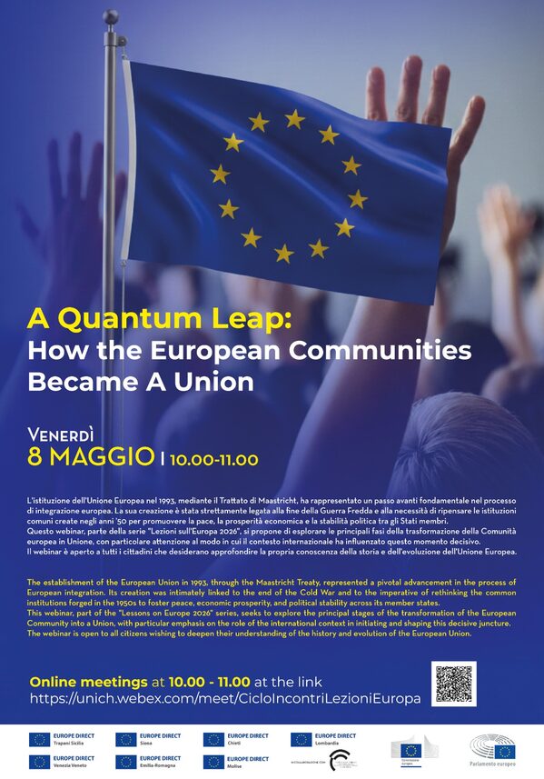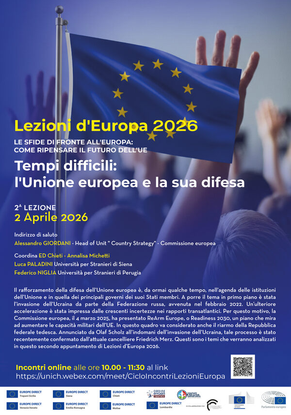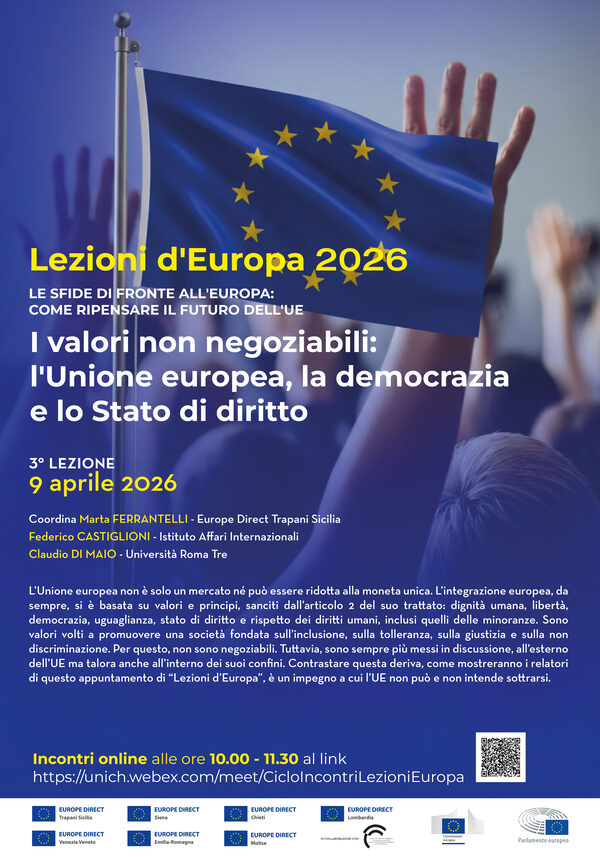 L’iniziativa nasce grazie alla collaborazione tra alcuni Centri Europe Direct della rete italiana, tra cui Europe Direct dell’Università di Siena, che coordina il progetto, Europe Direct Trapani Sicilia, Europe Direct Chieti, Europe Direct Venezia Veneto, Europe Direct Emilia-Romagna, Europe Direct Lombardia, Europe Direct Molise.Gli incontri si terranno on line dalle ore 10.00 alle 11.30 nelle seguenti giornate: 19/03 Capire l’Unione europea: istituzioni, politiche e processi decisionali - 02/04 Tempi difficili: l’Unione europea e la sua difesa09/04 I valori non negoziabili: l’Unione europea, la democrazia e lo Stato di diritto16/04 L’Atlantico si allarga: la crisi del rapporto USA–UE nel nuovo ordine globale23/04 Le priorità e le risorse: il Quadro finanziario pluriennale dell’UE30/04 Dall’AI Act al Digital Omnibus: l’Unione europea e la regolamentazione dell’intelligenza artificiale07/05 L’Unione europea e la transizione verde: a che punto siamo14/05 Dall’idea al finanziamento: guida alla progettazione europeaE' in fase di organizzazione un ulteriore webinar in lingua inglese che sarà inserito al termine dei primi 8.